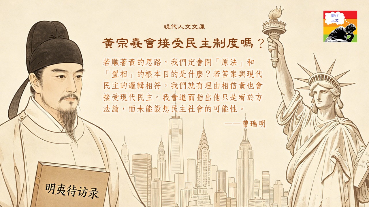 黃宗羲(1610–1695)是中國明末清初的重要思想家,他的名著《明夷待訪錄》中提出「天下為主,君為臣僕」的政治理念,強調國家與人民的利益高於君權私利。在君權獨大的社會,這無疑是叫人震驚的言論。但若用現在的角度看,則會質疑黃是否只是提出民本,而非民主。在這篇文章,我會集中討論「原法」和「置相」二篇,我的策略是,若順著黃的思路,我們定會問「原法」和「置相」的根本目的是什麼?若答案與現代民主的邏輯相符,我們就有理由相信黃也會接受現代民主。我會進而指出他只是宥於方法論,而未能設想民主社會的可能性。