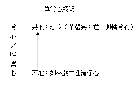 由此可見,「真心」或「唯真心」只是負責交待「心」之特質,當安立在真常心系統之因果二地時,便可分為「如來藏」與「法身」二者。故此,真常心系統其實若因果二地之劃分時,亦可判分為「如來藏系」與「華嚴法界」。而華嚴宗對「法身」之了悟,則有稱之為「唯一迴轉真心」。以下圖表,以示真常心系統對「真心」之劃分: