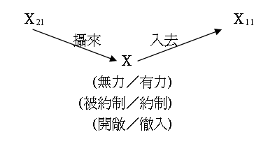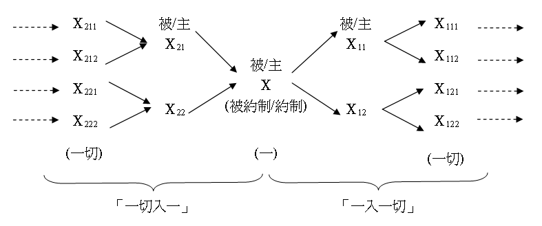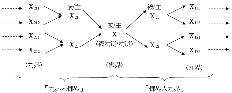 華嚴宗從最高、最圓融境界見事物存在之狀態乃處于一「約制」與「被約制」之關係網絡中(《佛家哲理通析》,頁53),如此前後相續、互相牽引而處于一無盡緊扣之關係中,如陳沛然先生之圖解: