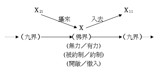 當「佛界」是「約制者」之身份,於是便有徹入之力,故其可徹入「九界」」(空而無力)之中。順此而言,當「佛界」是「被約制者」之身份,於是便成無力者全開敞;「九界」(有力者)全徹入,如此二者乃至一切法皆可互相相入。