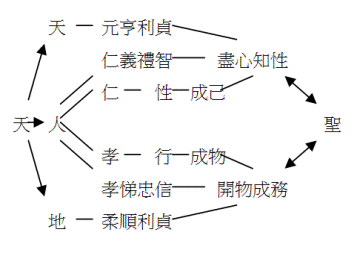天既與人仁義禮智,亦與人孝悌忠信,以完成對仁義禮智之體認與踐履。此一孝悌忠信居於心中,乃是心之體、性之用。但受氣質之影響,並非每個人都可以順利起用,只有生而知之者才可以窮神知化。孔子之孝即是直體天命,述而不作,所述者乃是天理,此理不為堯存,不為桀亡,添不得亦減不得,實無所謂作也。孟子區分「由仁義行」與「行仁義」(《離婁下》)。聖人行處坐臥,皆合于天理,乃「由仁義行」。凡人既無生知之質,但若遵守「學而時習之」之敎訓,去「行仁義」,亦可成德。在此過程中可以觸發對天理之體認,第二層次之孝可轉為第一層次之孝,故人人可以成聖。