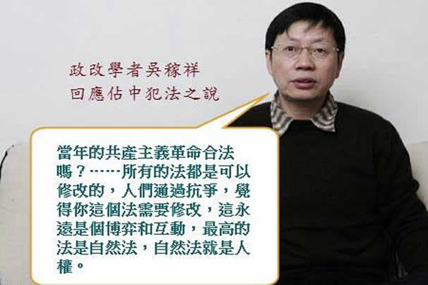 近來常有人指摘佔領中環「非法」,吳稼祥怒駁乃是「廢話」。他反問:「當年的共產主義革命合法嗎?共產黨當時上井岡山是不是合法?法都是處於統治地位的人制定的東西,假如是人們覺得你的法是不合法的,那怎麼辦?如果都合法的話,怎麼會有革命呢?所有的法都是可以修改的,人們通過抗爭,覺得你這個法需要修改,這永遠是個博弈和互動,最高的法是自然法,自然法就是人權。世界歷史數千年,沒有一個法能夠阻擋人們的需求。」