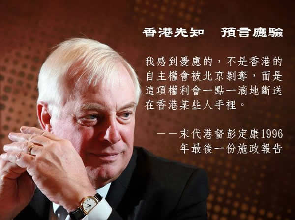 我感到憂慮的,不是香港的自主權會被北京剝奪,而是這項權利會一點一滴地斷送在香港某些人手裡。(末代港督彭定康1996年最後一份施政報告)