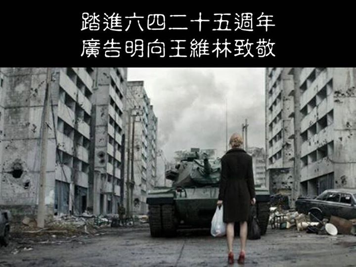 法國男士香芬品牌AXE和非牟利組織Peace One Day合作推出香芬產品,宣傳9月21日的國際和平日,近日在網上推出電影感十足的廣告〈Make Love Not War〉,片段中有位女士拿著白色膠袋站在坦克前,明顯向當年六四隻身擋坦克的王維林致敬。
