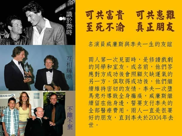 剛身故的著名演員羅賓•威廉斯(Robin Williams)與曾主演超人的另一著名演員基斯杜化•李夫(Christopher Reeve)一生的友誼