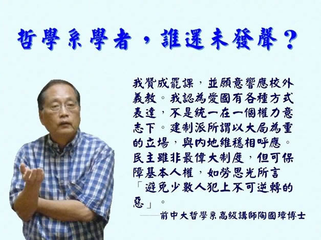 哲學是理性的徹底反省的學問。人大日前於政改上連落三閘,是違反民主發展歷史潮流的、非理性的決定。我們期待香港有更多的哲學學者,像陶國璋先生那樣,勇於公開向非理性的政權說「不」!