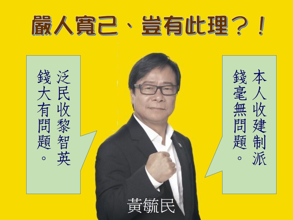 相反,黃毓民自己被人踢爆收政治捐款,表面看來問題嚴重得多;但他卻持雙重標準,對自己涉嫌黑金政治沒有任何合理的交待。