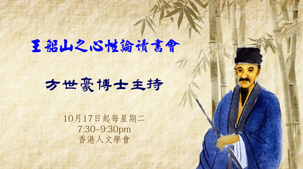 中 國 文 字 把 「 生 」 和 「 心 」 合 成 為 一 「 性 」 字 , 象 徵 中 國 思 想 是 由 心 靈 和 生 命 合 成 一 整 體 而 言 性 。 而 此 具 有 普 遍 意 義 的 心 和 生 , 也 貫 通 到 宇 宙 人 生 全 體 。 所 以 中 國 文 化 之 性 , 不 是 生 物 學 中 限 於 生 物 現 象 的 生 , 也 不 是 經 驗 心 理 學 中 限 於 心 理 現 象 的 心 。 中 國 人 面 對 生 命 心 靈 整 體 而 言 性 , 所 見 或 偏 或 全 , 或 深 或 淺 , 故 有 不 同 時 期 , 不 同 說 法 的 人 性 之 學 。 本 讀 書 會 會 根 據 唐 君 毅 先 生 著 的 《 中 國 哲 學 原 論 ‧ 原 性 篇 》 中 有 關 篇 章 , 對 王 船 山 之 心 性 論 作 較 深 入 的 了 解 。 歡 迎 對 中 國 文 化 有 興 趣 者 參 加 。
