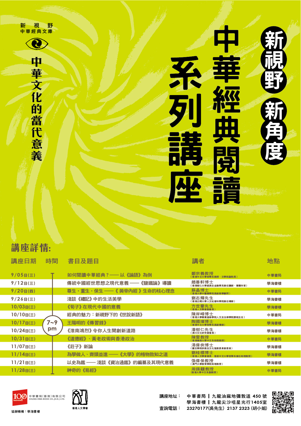 2 0 1 2 年 , 中 華 書 局 為 紀 念 1 0 0 周 年 華 誕 , 陸 續 推 出 《 新 視 野 中 華 經 典 文 庫 》 , 旨 在 弘 揚 中 華 優 秀 文 化 , 為 古 代 經 典 與 現 代 生 活 架 起 溝 通 的 橋 樑 。 文 庫 由 國 學 大 師 饒 宗 頤 任 名 譽 主 編 , 香 港 本 地 及 海 內 外 知 名 學 者 承 擔 編 選 和 導 讀 工 作 。 另 外 , 局 方 更 與 香 港 人 文 學 會 及 學 海 書 樓 兩 機 構 合 作 , 主 辦 「 中 華 經 典 閱 讀 」 系 列 講 座 , 以 作 配 合 。 本 系 列 講 座 將 廣 邀 本 地 海 內 外 知 名 學 者 主 講 , 每 講 以 一 部 中 華 經 典 為 主 要 內 容 , 期 望 能 在 本 地 推 廣 經 典 閱 讀 的 風 氣 , 使 中 華 文 化 得 以 繼 往 開 來 , 傳 遍 天 下 。