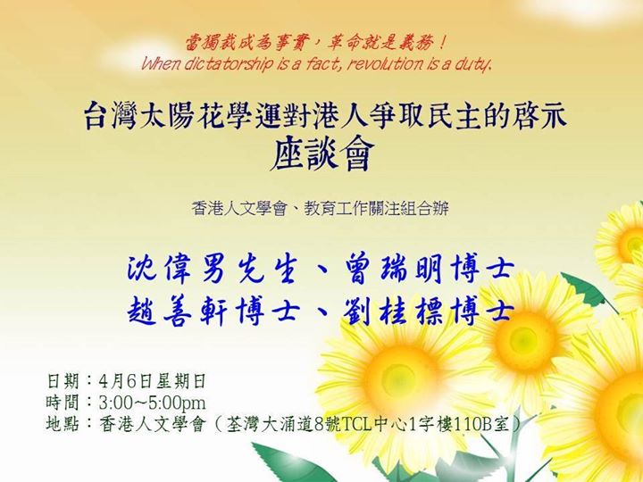 太 陽 花 學 運 , 又 稱 3 1 8 學 運 、 佔 領 國 會 事 件 等 , 指 2 0 1 4 年 3 月 1 8 日 起 台 灣 的 大 學 生 發 起 的 民 主 運 動 。 事 緣 台 灣 政 府 以 不 符 合 程 序 正 義 方 式 在 立 法 院 通 過 與 中 國 政 府 合 作 的 服 貿 協 議 , 學 生 為 反 對 政 府 的 黑 箱 作 業 而 佔 領 台 灣 立 法 院 多 天 , 甚 至 一 度 佔 領 行 政 院 , 後 者 更 導 致 政 府 的 血 腥 鎮 壓 , 從 而 成 為 國 際 社 會 關 注 的 大 事 , 甚 至 被 人 將 事 件 與 八 九 年 天 安 門 事 件 相 提 並 論 。 本 運 動 的 性 質 是 什 麼 ? 它 是 否 具 合 理 性 和 正 義 性 ? 它 對 香 港 人 爭 取 民 主 和 真 正 普 選 , 特 別 是 佔 領 中 環 或 捍 衛 本 土 等 運 動 有 些 什 麼 重 要 的 啟 示 ? 我 們 將 以 座 談 會 的 方 式 與 大 家 一 起 思 考 和 討 論 。