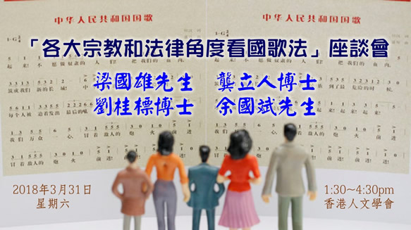 政 府 剛 向 立 法 會 政 制 事 務 委 員 會 提 交 文 件 建 議 , 任 何 人 公 開 及 故 意 篡 改 國 歌 歌 詞 、 曲 譜 , 以 歪 曲 、 貶 損 方 式 奏 唱 國 歌 , 或 以 其 他 方 式 侮 辱 國 歌 , 即 屬 犯 罪 , 一 經 定 罪 , 可 處 第 五 級 罰 款 及 監 禁 三 年 。 我 們 舉 辦 座 談 會 的 目 的 , 除 了 討 論 該 法 例 相 關 條 文 有 不 合 法 理 及 難 以 執 行 等 問 題 外 , 還 希 望 藉 此 提 醒 人 們 , 以 立 法 強 迫 尊 重 國 歌 , 只 是 極 權 主 義 一 種 強 迫 公 民 服 從 的 手 法 。 真 正 對 國 家 的 尊 重 乃 出 自 公 民 的 內 心 , 國 家 必 須 是 以 自 由 民 主 的 仁 政 來 得 到 民 心 , 以 高 壓 方 法 令 人 服 從 只 會 適 得 其 反 。